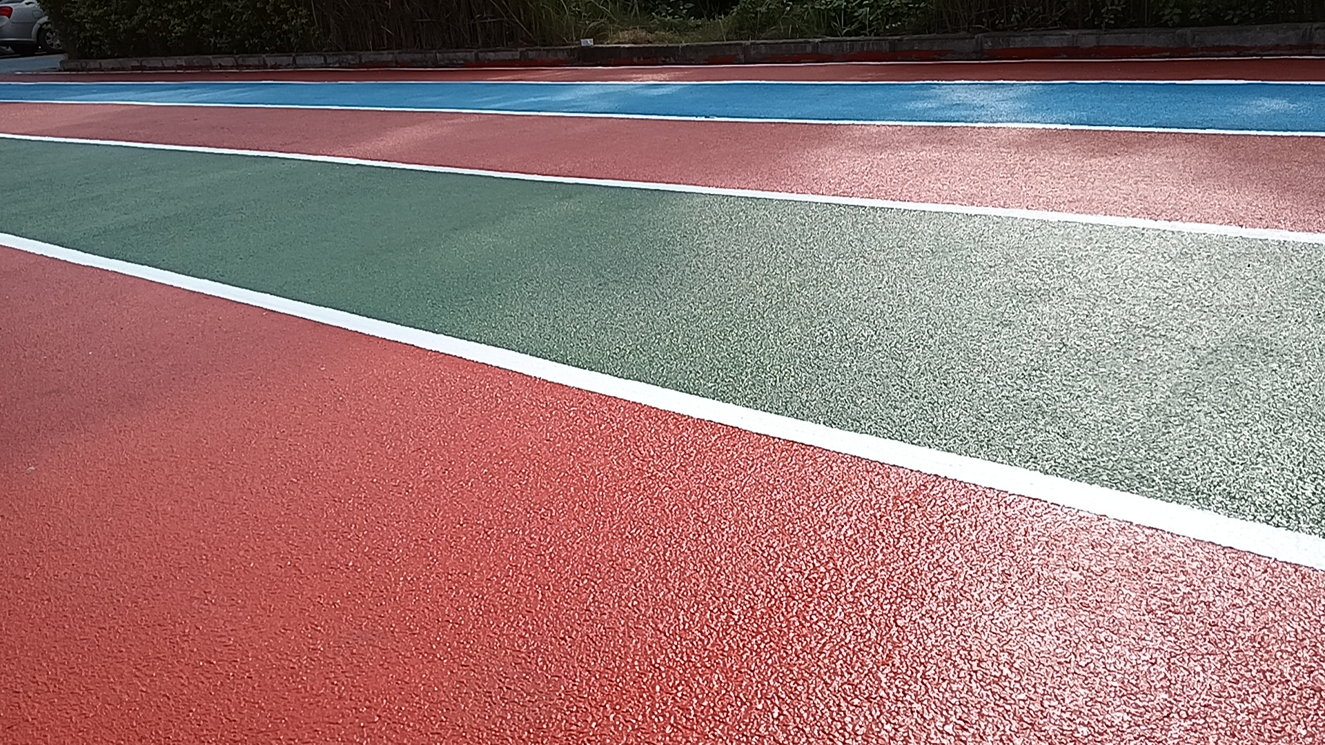 公司彩虹跑道实验铺装已经满4年,含有红、绿、蓝三个颜色(其中一道为预制型卷材),表面没有涂装任何覆盖层。历经4年,绿色的稍有褪色,红色、蓝色跑道面漆都没有褪色;表面污渍较多、但都没有粉化掉色。近日公司技术部同事对我司生产基地的彩虹跑道进行了翻新。采用材料为S-30聚脲耐磨面层材料。(翻新前)(翻新中)(翻